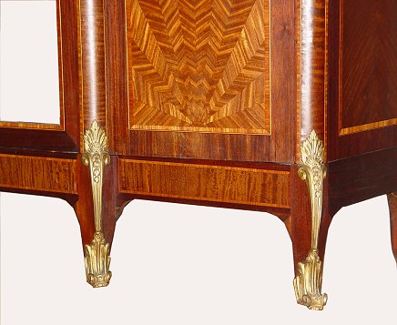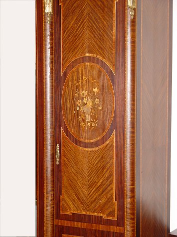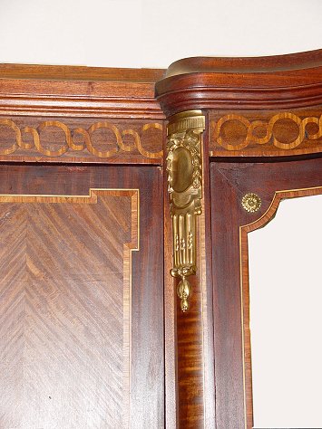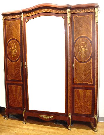 ELEGANT FRENCH LOUIS XV STYLE ORMOLU ARMOIRE: Triple door with center door covered in large beveled mirror. Kingwood and tulip with oval marquetry medallions to the side doors. Adjustable interior shelving. Ca. late 19th early 20th C.. Approx. 91 1/2'' x 76 1/2'' x 20 1/2''.