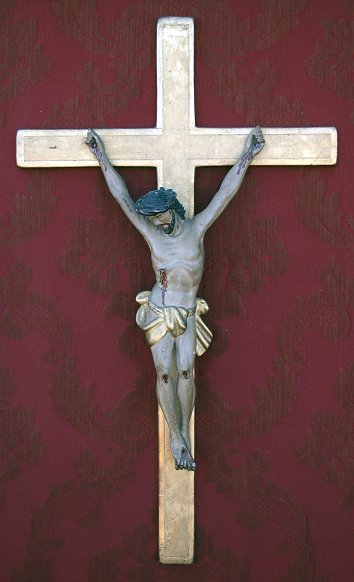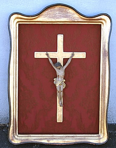 19TH CENTURY CARVED AND POLYCHROME FIGURE OF CHRIST: Framed in a later antiqued gilt molding shadow box style Corpus Christi, gilded cross has small crack in upper portion in the gilt, there is some minor wear, crack in his right arm, several flecks of missing paint, overall 33'' x 23'', figure of Christ is 12 1/2'' height and 7'' width.