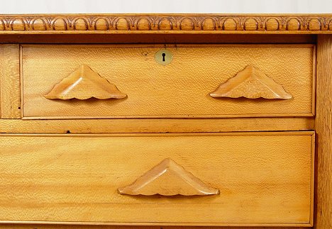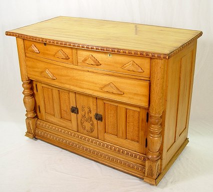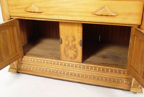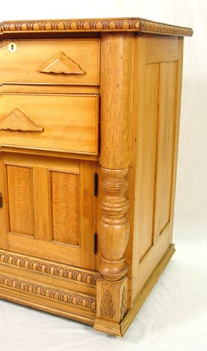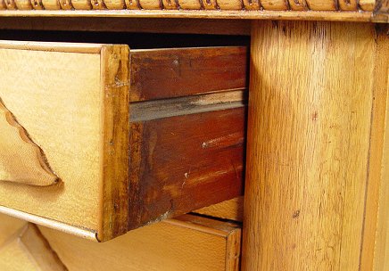 19TH C MAPLE BUFFET: Two over three bowed drawers overhang cabinet doors. Carved columnar stiles, gadroon molding edge. 38''h. x 51'' x 37''.