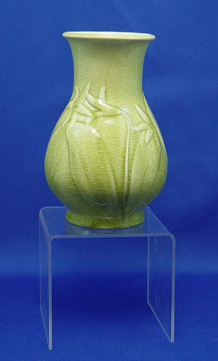 ROOKWOOD POTTERY VASE: #6830 with wistful floral decoration, crazed high gloss chartreuse glaze. No chips or cracks. 6 1/2''h.