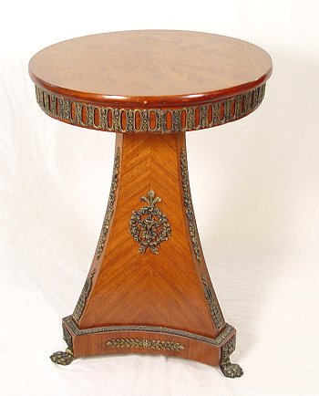 LOUIS XIV STYLE ORMOLU AND PARQUETRY INLAY STAND: Round top stand with ray motif parquetry. The apron and three sided pedestal base have ormolu mounts, the claw feet are gilt metal also. 32 1/2''h., 23 3/4'' dia.