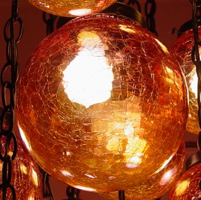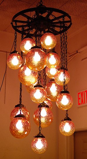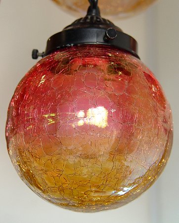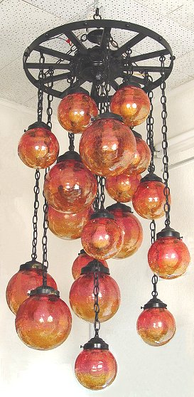 BLACK IRON WAGON WHEEL CHANDELIER WITH CRANBERRY GLASS SHADES: 17 cranberry shaded to amber crackle glass globe shades hang in random length from a 12 spoke iron wheel. The wheel is 24'' dia. Chandelier hangs approx. 52'' from ceiling.