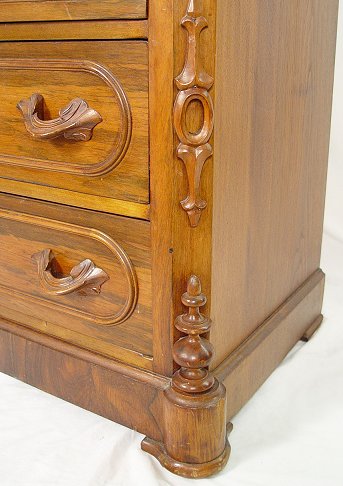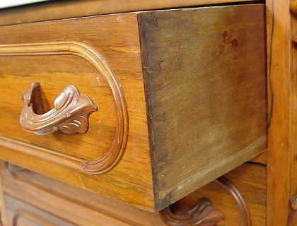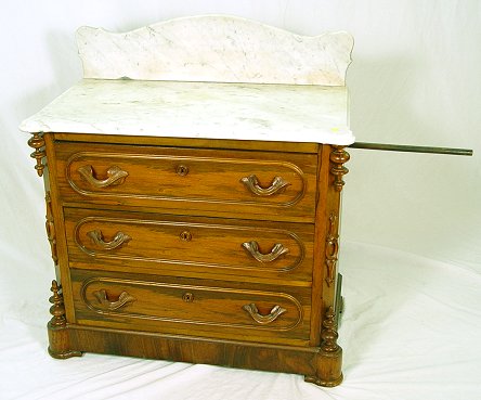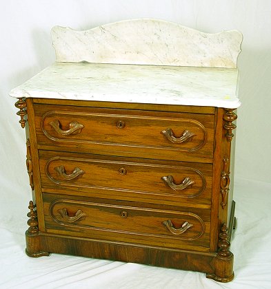 WALNUT VICTORIAN RENAISSANCE REVIVAL MARBLE TOP COMMODE: 3 drawers with carved pulls under a beveled white marble top with shaped backsplash and cut cookie corners. 29 1/2''h. x 34'' x 19''.