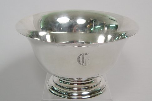 STIEFF STERLING ''PAUL REVERE'' CENTER BOWL CA. 1941: Hallmarked Steiff and the year marking F (1941). Approx. 18.51 oz. 9'' dia. 5''h. Monogrammed C.