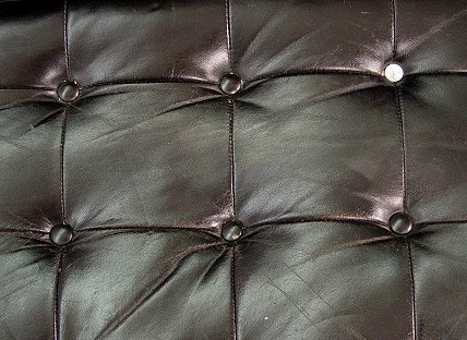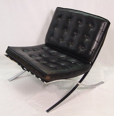 MIES VAN der ROHE DESIGNED BARCELONA CHAIR: Button tufted black leather on chrome. This is an older chair and does show signs of gentle use. 28''tall, 29 1/2''w.