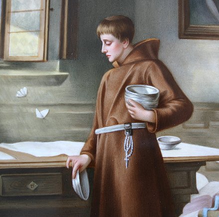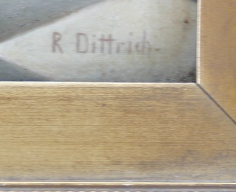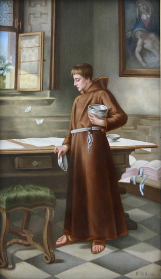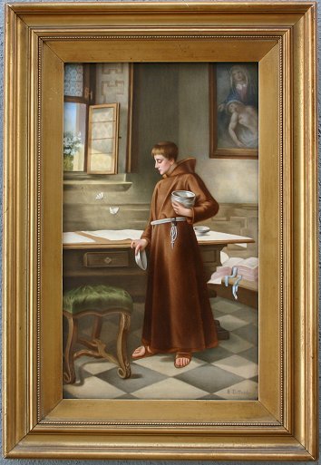 KPM PAINTED PORCELAIN PLAQUE: Depicts a monastic interior with robed priest contemplating, 13 1/2'' x 8'', signed lower right R. Dittrich, embossed KPM mark verso with religious verse inscribed, vintage gilded frame with minor wear, 18'' x 12 1/4''.
