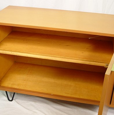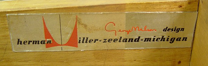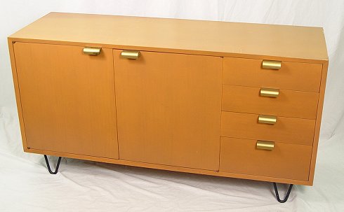 GEORGE NELSON FOR HERMAN MILLER CREDENZA: Sleek straight lines. 4 drawers next to cabinet door. Black iron legs. 29''h. x 56'' x 65''.