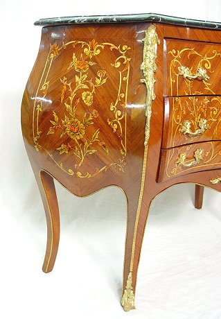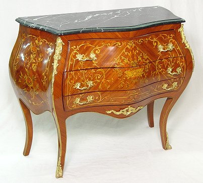 FRENCH MARQUETRY INLAY MARBLE TOP COMMODE: Green marble over an ormolu mounted bombay 2 over one drawer chest. 34''h, x 47'' x17''.