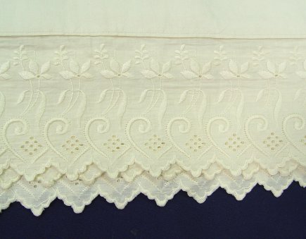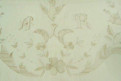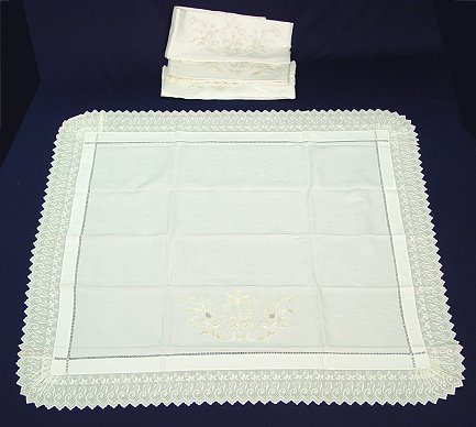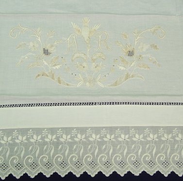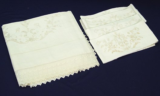 FIRST OF THE EXQUISITE LINENS- EMBROIDERED COTTON SHEET SET: Two pairs of lace rimmed pillow covers and matching bed cover or sheet. Embroidered in a bird design, monogram AR. Sheet is 118'' x 111'', the pillow covers are 44'' x 38''.