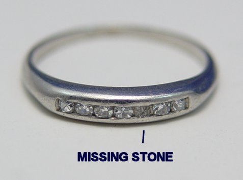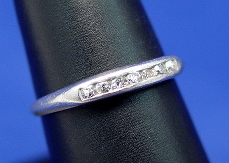 DIMINUTIVE PLATINUM BAND: Dainty little band of platinum channel set with six tiny diamonds (used to be seven but one crushed), 3 grams, size 6.75. Est. $150/200**
