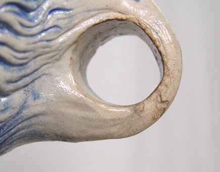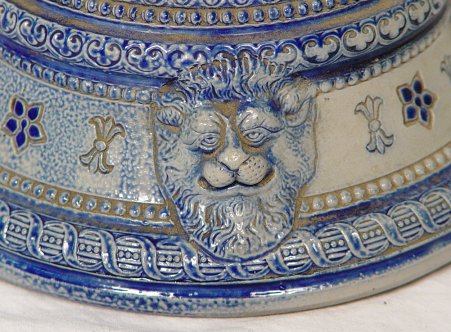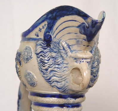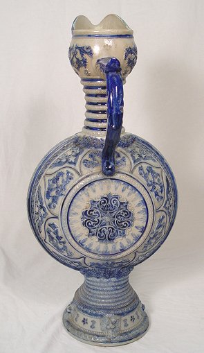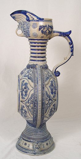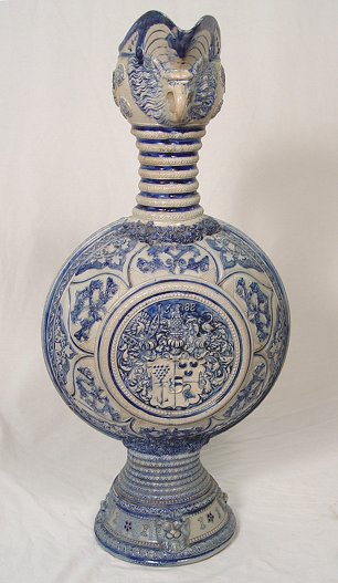 A MOST UNUSUAL OVERSIZED GERMAN COBALT DECORATED STONEWARE JUG: 32''h. jug. Griffin head spout and heraldic imagery. 15'' diam. at the center.