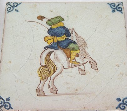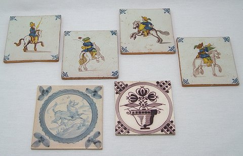 LOT OF SIX FAIENCE TILES: Four decorated with mounted riders, terra cotta colored clay, approx. 5 1/8'' square; mulberry decorated in a potted floral plant design, earthenware clay, 5'' square; and a contemporary Spanish tile in a equestrian design, 6'' square.