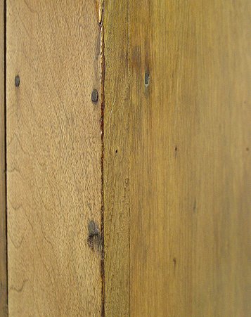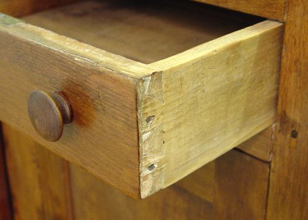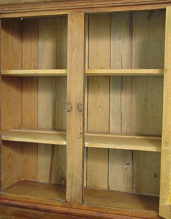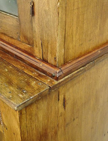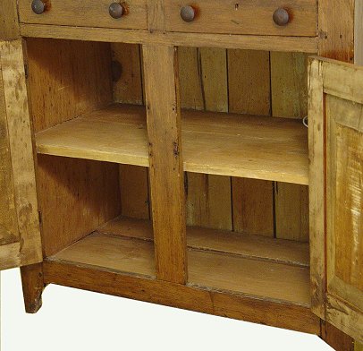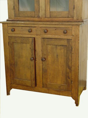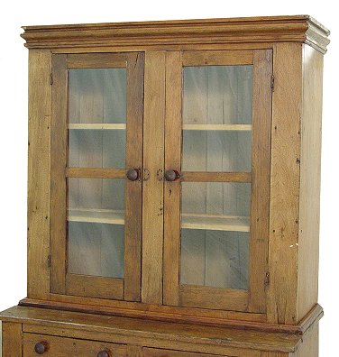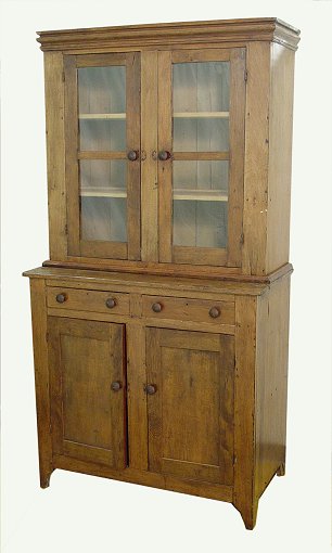 EARLY STEPBACK CUPBOARD: Two part cabinet with upper section having glass front doors under straight molded cornice. Lower section with cabinet doors. Rose head nail construction. Approx. 78''h., x 41'' x 21''.