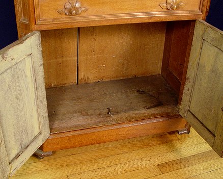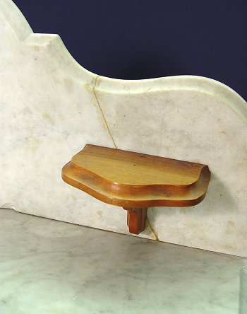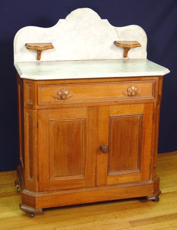 WALNUT VICTORIAN RENAISSANCE REVIVAL MARBLE TOP WASHSTAND: Walnut one drawer over double doors with carved pulls. Canted sides. White marble top and backsplash (the backsplash does have a crack) with candle shelves. 30''h. plus the 12'' back.