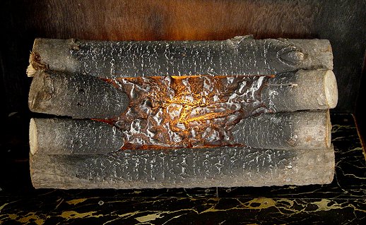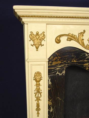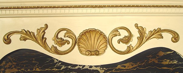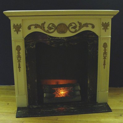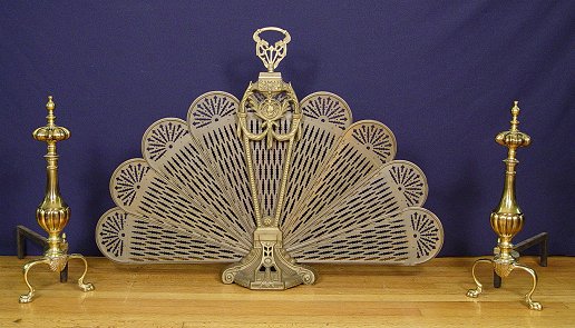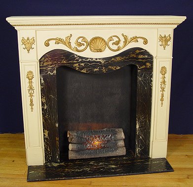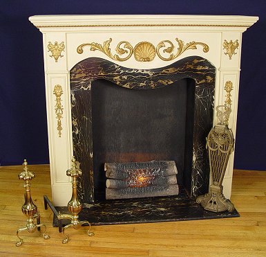 DECORATIVE ELECTRIC FIREPLACE & ACCESSORIES: Paint and gilt finish with faux marble hearth and surround. Complete with brass andirons, peacock firescreen, ''logs'', and tools. 48''h. x 53'' x 19 1/2''.