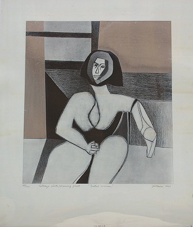 POLLARO, Paul, (American, 1921-): ''Seated Woman'', Collage Photo/Drawing Print, 13 1/8'' x 12'', with margins 20'' x 15 7/8'', signed in pencil and dated 1967 lower right, also numbered 48 of 100 lower left with medium and title in lower margin, purchased from the Ferdinand Roten Galleries in Baltimore, Maryland, sold with original mat from the gallery, unframed. Condition - Does have a small crease in the upper margin of the image.