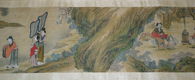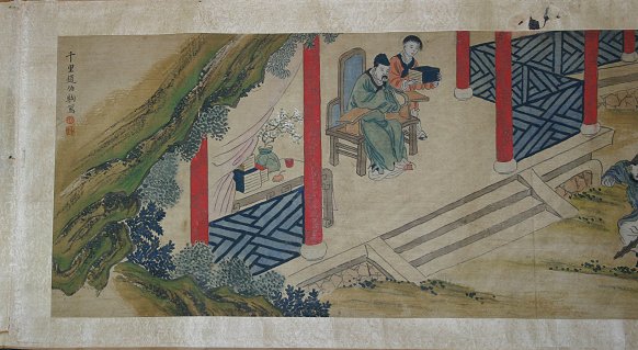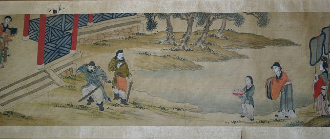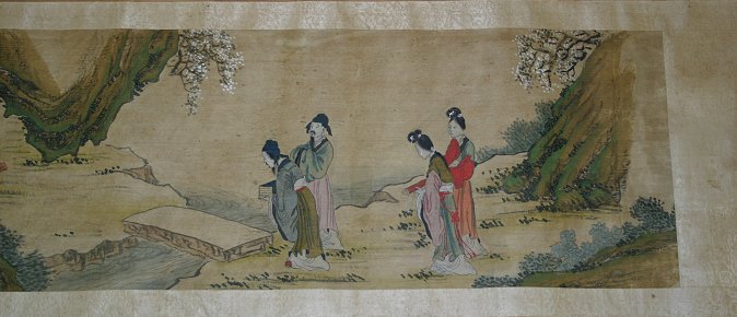 ORIENTAL W/C SCROLL CIRCA 1920(?): Scenes depict various daily outdoor activities, roughly 142'' length, 14'' height, there is a chop signature in the upper left corner and an individual panel signature on the right end, this does roll, unframed. Condition - Edges show some minor wear and tear from repeated unrolling, several areas of missing paper and 1/4 size hole evident in the first third of the scroll. Est. $300/500**