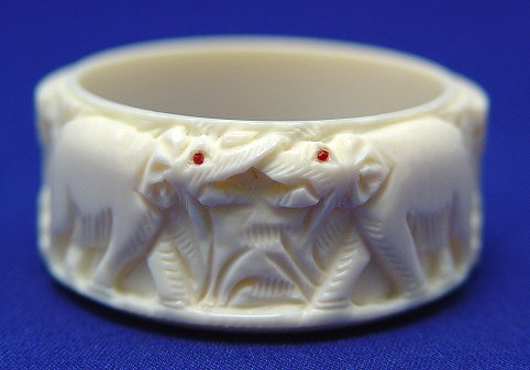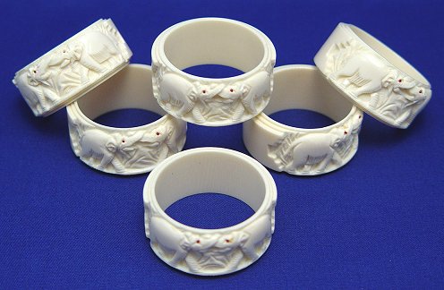 SET OF 6 CARVED IVORY NAPKIN RINGS: Each with two elephants greeting, approx. 1 3/4''dia. x 3/4''h.