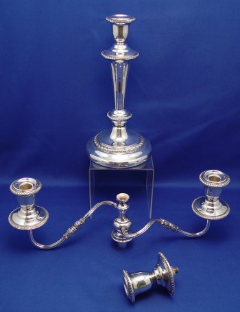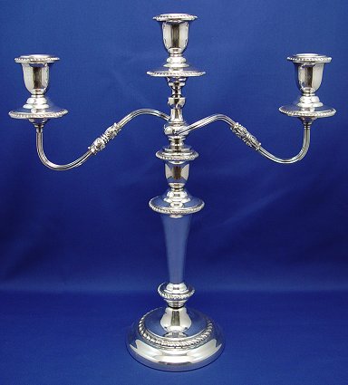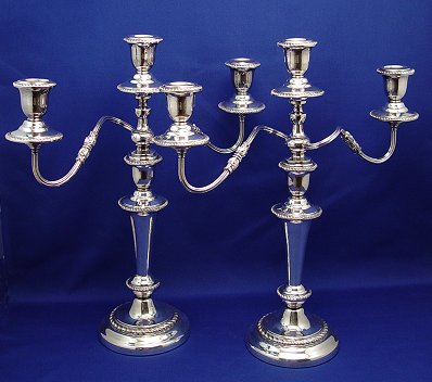 PAIR OF 3 LIGHT SILVERPLATED CANDELABRA: Silver on copper, unidentified maker. Curved arms. Converts to 11'' single holders. 18 1/2''h. overall.