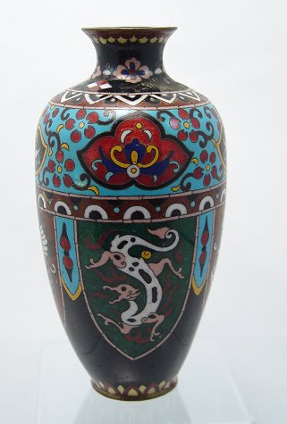 DRAGON DECORATED CLOISONNE VASE: Goldstone and black ground decorated with dragons in a rich jeweltone coloration. Some pitting. 7 1/2''h.