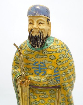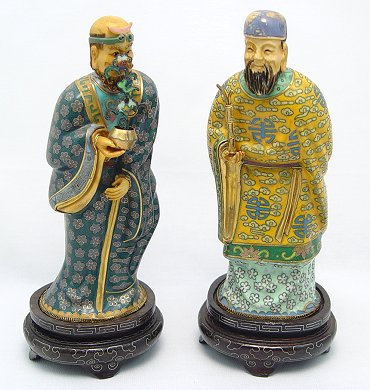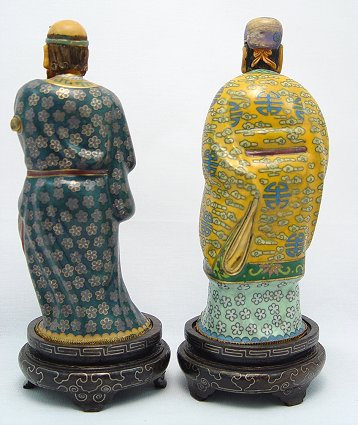 PAIR OF CLOISONNE FIGURES: Figure of Elders in colorful robes. Ivory or bone type heads and hands. On decorative wooden stands. 8''.