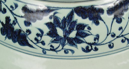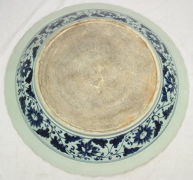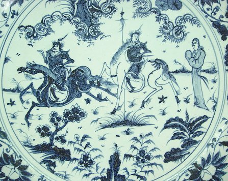 LARGE BLUE AND WHITE GLAZED CHARGER: Depicting oriental figures and 2 horses with trees and plants. Vines and sunflowers surround the outer edges. Actual age unknown, approximately 24 1/2'' diameter. Est. $250/400**