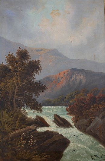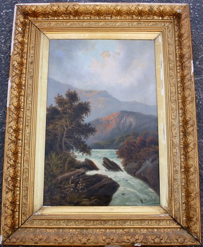 MARSHALL, R., (English, 20th C): English landscape with mountains and rushing rapids, O/C, 24'' x 16'', signed lower right, encased in a period embossed gilt molding with extensive gilt loss around the edges, 33 1/4'' x 25 1/2''. Condition - Stretcher bar wear and all margins with some evidence of minor paint loss, several pinholes on the canvas and craquelure throughout,