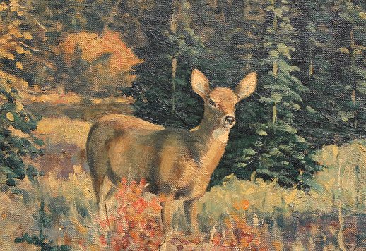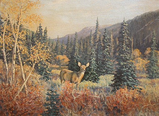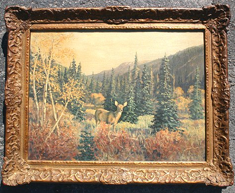 PETERS, Leslie, (American, 1916-): Doe in an autumnal Northwestern landscape, O/CB, 18'' x 24'', signed lower right, encased in an embossed period gilded frame in superior condition, 23 1/2'' x 30''. Condition - Needs cleaning.