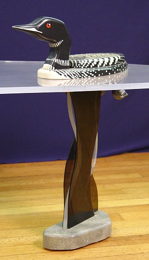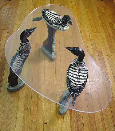 FOLK ART DUCK COFFEE TABLE: Lucite ''pond'' table base with ducks. Purchased at a market in Danbury CT. 26''h. x 48'' x 25 1/2''.
