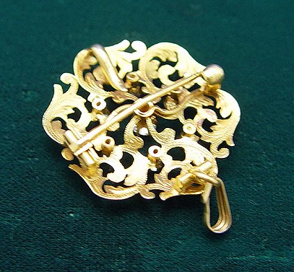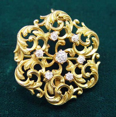 ART NOUVEAU SCROLLING FILIGREE DIAMOND PIN/PENDANT: Lovely scrolling acanthus leaves of 18k (assayed) yellow gold set with seven diamonds, approx. 40pts total. 1''dia, 5.6grams. Pin closure, pendant bail hinged for hiding and charm or watch loop to bottom. A truly multi-functional piece of jewelry. Est. $500/700**