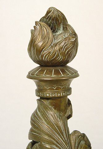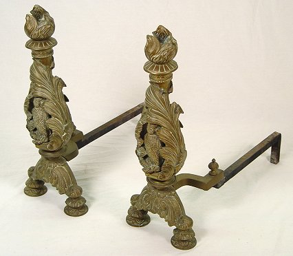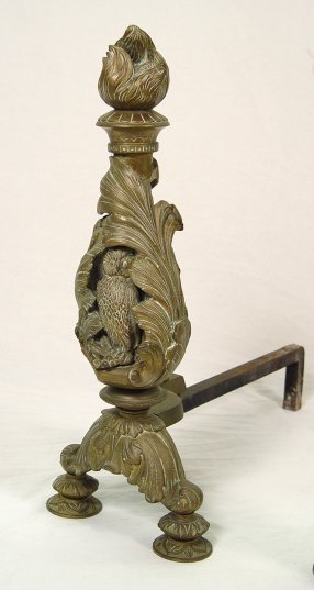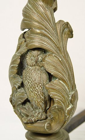 THE BEST BRASS (BRONZE?) ANDIRONS: Flame finials over and a hidden owl surrounded by acanthus leaf. A very heavy and substantial decorative element. 23''h.