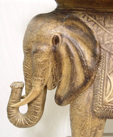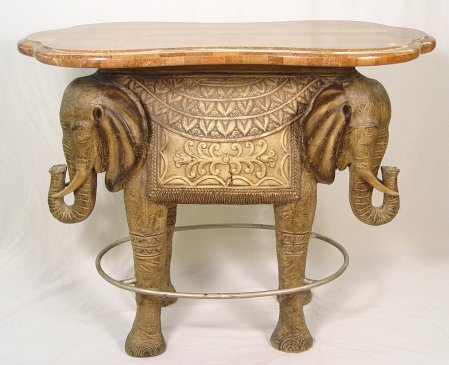 CONTEMPORARY EXOTIC ELEPHANT BAR TABLE: The base is in the form of two headed elephant, the faux marble top is hour glass shaped. There is a foot rail around the base. 42 1/2''h., the top is 2' x 4 1/2'.