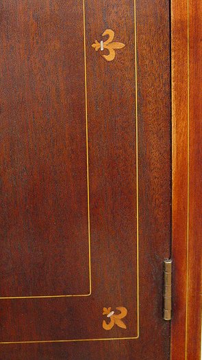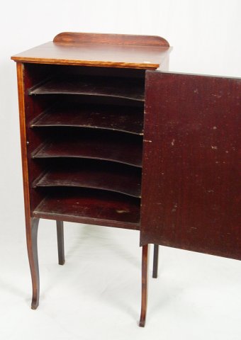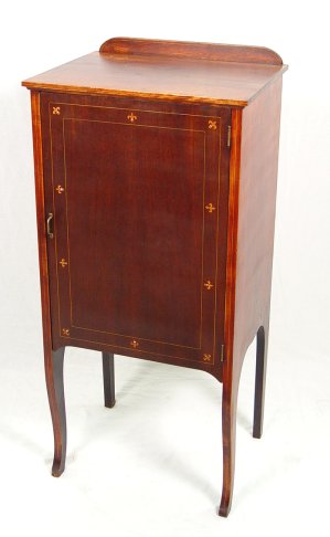 MAHOGANY FLEUR-DE-LIS INLAID MUSIC CABINET: One door sheet music cabinet with interior pull out shelves. The door is graced with a band of fleur-de-lis. Raised on fine cabriole legs. 40 1/2''h., x 18 1/2'' x 15.