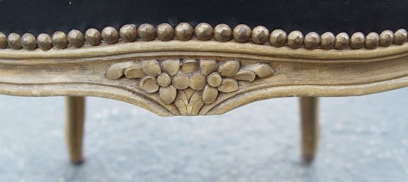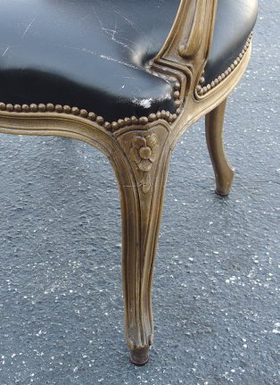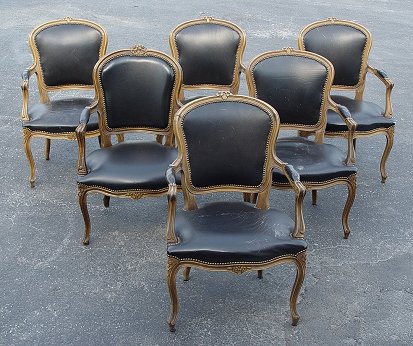 SET OF 6 LOUIS XVI STYLE FAUTEUIL CHAIRS: Open arm chairs with carved frames, black leather seats and backs. 2Oth C. gently used condition. 34''H. x 22'' x 23''.