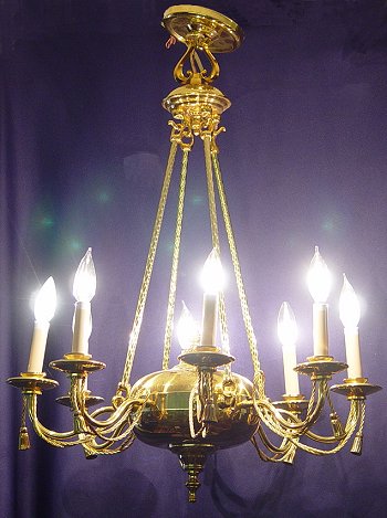 DECORATIVE BRASS CHANDELIER: 8 light fixture with a cord and tassel motif. Hangs approx. 24''.