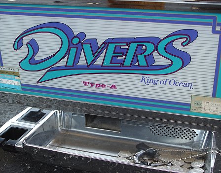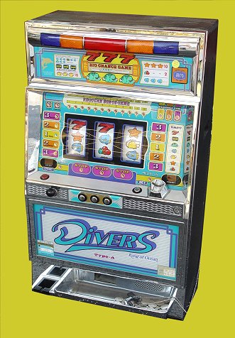 YAMASA SLOT MACHINE: Shiny chrome one arm bandit goes by the name of ''Divers''. Match three in a row. Yamasa label. 32''h., x 19'' x 15''.