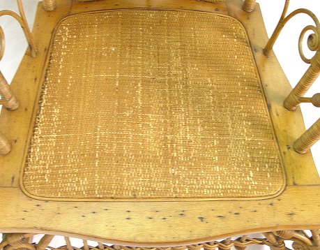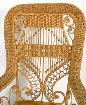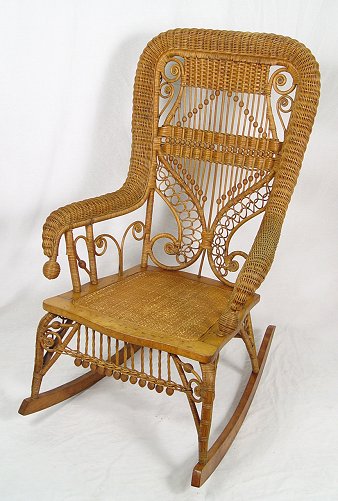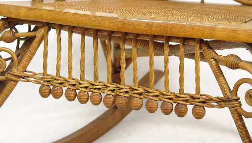 HEYWOOD BROS. & CO. CURLY Q AND BALL WICKER ROCKING CHAIR: Natural finish, label on the underside of the seat. 43''h, 26 1/2''w. Pre Wakefield, Ca. late 1800's.