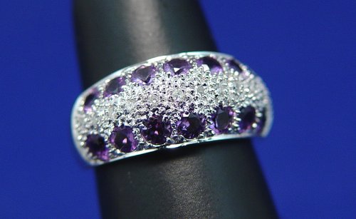 AMETHYST AND DIAMOND RING: 14 small round cut amethysts set in rows of 7, flanking a center bead set row of tiny diamonds, 14k white gold, marked EA 14k 585, size 7.