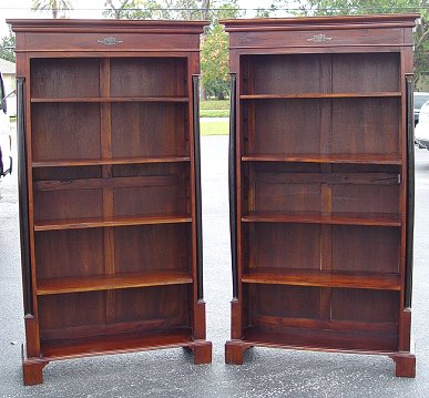 DECORATIVE PAIR OF MAHOGANY OPEN BOOK CASES: Adjustable wood shelves, columnar stiles. Later 20th C. 74''h. x 42'' x 13 1/2''.