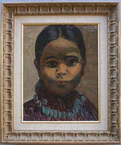 FREDERICK, George, (American, 1889-): A young Indian girl, O/C mounted on Board, 13 1/2'' x 10 1/2'', signed upper right, dated 1942, Buck Saunders Picture Frames, Scottsdale, Arizona label affixed verso, encased in a later carved molding, worn, 19 1/4'' x 16''. Condition - Some loss of canvas in upper right corner, needs cleaning, several minor flecks.