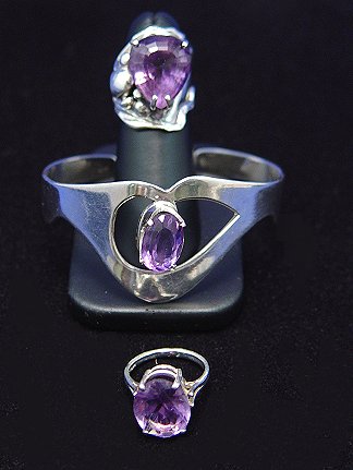 3 PC LOT OF STERLING AND AMETHYST JEWELRY: Featuring a cuff bracelet with floating oval cut stone, 8.8 x 13.5 x 6.5mm; simple galleried ring set with broader oval cut stone, 11.5 x 14 x 7.3mm, size 5.75; and an amazing pear shaped stone, 14.5 x 17.2 x 11.8mm, set in a free form mount, size 6.5. All stone measurements approx., thanks.