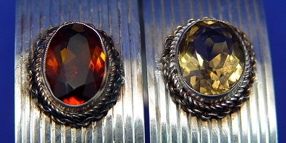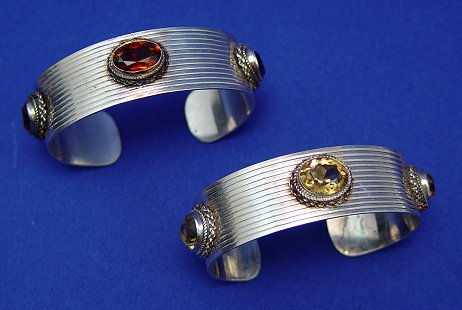 PAIR OF PERUZI 800 SILVER CUFF BRACELETS: Identical ribbed bracelets set with different stones. One citrine?, the other amber?, both with Florence plaque mark to insides.