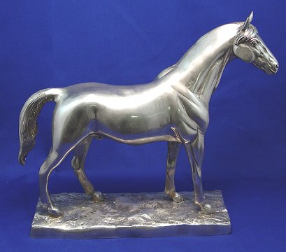 LARGE CAST METAL SCULPTURE OF A HORSE: Chrome colored metal figure of a stallion standing at attention. On matching metal ground, overall 18''l. x 15''h. x approx. 4''w., heavy - approx. 15#.