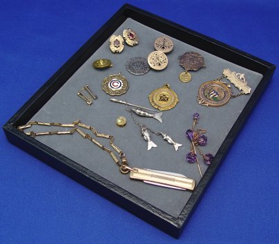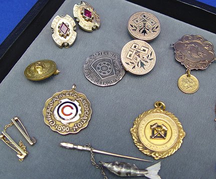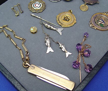 LOT OF ESTATE JEWELRY & COLLECTIBLES: To include, 14k yellow gold medal presented to Elizabeth Cuthet, ''To the Oldest Lady Settler'' at the Old Settler Picnic Chicago 1907; an etched gold filled pin with an 1853 Liberty head gold dollar suspended below (hole in coin); medal from 1890 Chicago Athletic Association dated 1905 presented to Jamee W. Wayman for winning the 40yd Hurdle; 1903 Indian Head penny pressed into a three dimensional pin; stick pins - two with purple glass? beads and one with reticulated fish; a gold filled watch chain; gold filled pocket knife; opal and seed pearl slide; Victorian enameled studs; Victorian etched clip earrings with garnets? and seed pearls; 1924 Masonic coin. Wonderful collection sold as a lot.