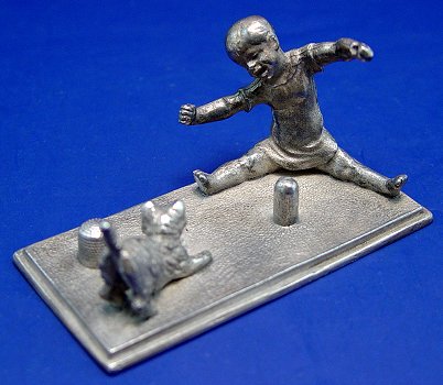 LUCIUS HART SILVERPLATED FIGURAL THIMBLE STAND: Also hold a spool of thread. Child with cat. Bears the hallmark of Lucius Hart of New York, a firm that has no record after 1874. 1 3/4''h. ,x 4''. x 2''.