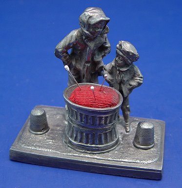 FIGURAL SILVERPLATED PIN CUSHION THIMBLE HOLDER: Holds two thimbles. Two children dressed for the cold. No identifying marks. Approx. 3 1/4''h. x 3 1/2'' x 2''.