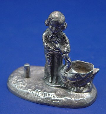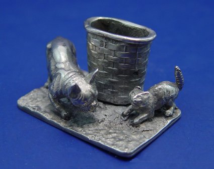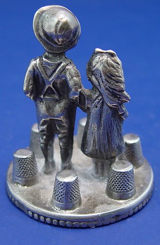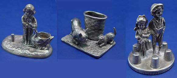 GROUP OF 3 SILVERPLATED FIGURAL THIMBLE HOLDER PIN CUSHIONS: 1) A boy and girl stand holds five thimbles, 2 1/2''h, no makers marks. 2) Young boy with a goose pincushion, stand holds 1 thimble. Marked Germany. 3) Dog and cat with a basket pin cushion. Marked Darco 76. Age unknown on all 3. The pincushion stuffing is not intact.