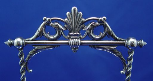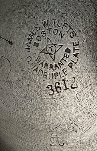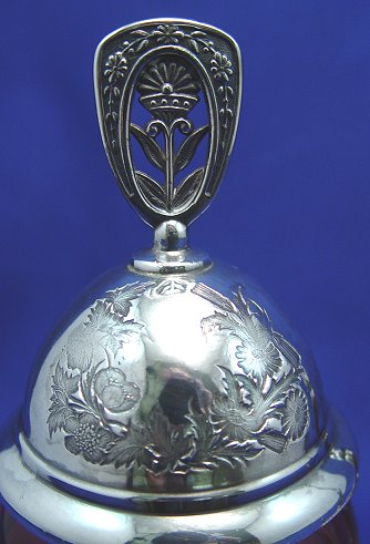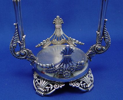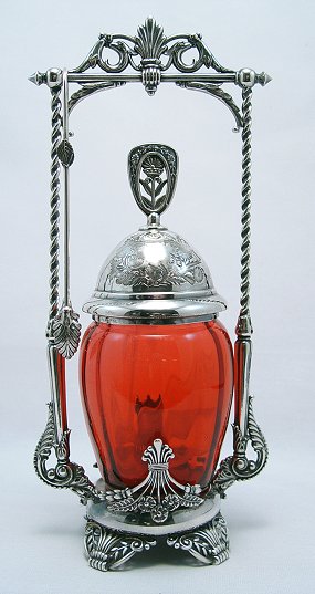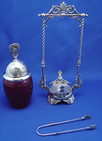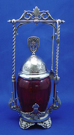 JAMES TUFTS CRANBERRY GLASS PICKLE CASTOR WITH TONGS: Ornate silverplated frame holds a barrel shaped, cranberry glass jar. Please note restoration to one of the scrolls near the base, and chips along the rim of the jar. 12''h.
