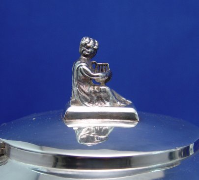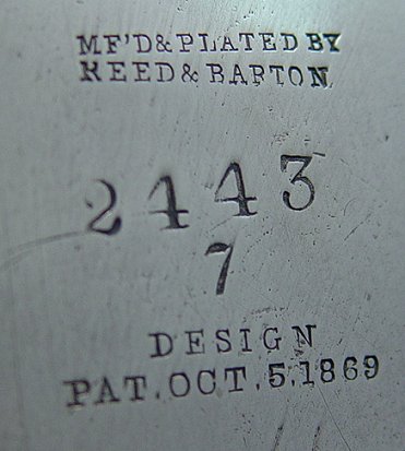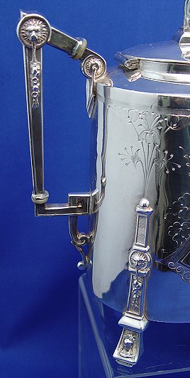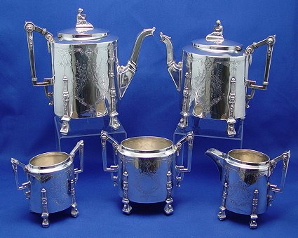 VICTORIAN REED & BARTON SILVERPLATE TEA SERVICE: Design number 2443. Fine detailing on this 5 piece set. Figural finials on the lids, lion head masquerons on the handles, lady head masquerons on the feet. Engraved decoration, no monograms. Includes 2 pots, open cream pitcher, open sugar, and waste bowl. The tallest of the pots is 9 1/4''h.