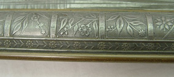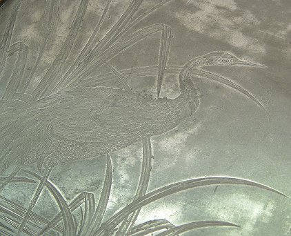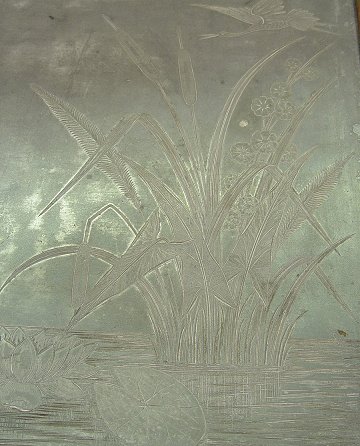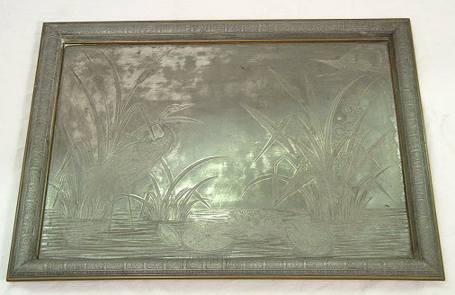 PAIRPOINT QUADRUPLE PLATE ETCHED TRAY WITH COPPER TRIM: Beautiful scene of a wading heron or egret with lilypads and cat tails, 19'' x 25'', raised rolled edge decorated in floral and foliate panels. Very worn plating, ok it's mostly gone, dent to center upper section, some scratching. 13 lbs.